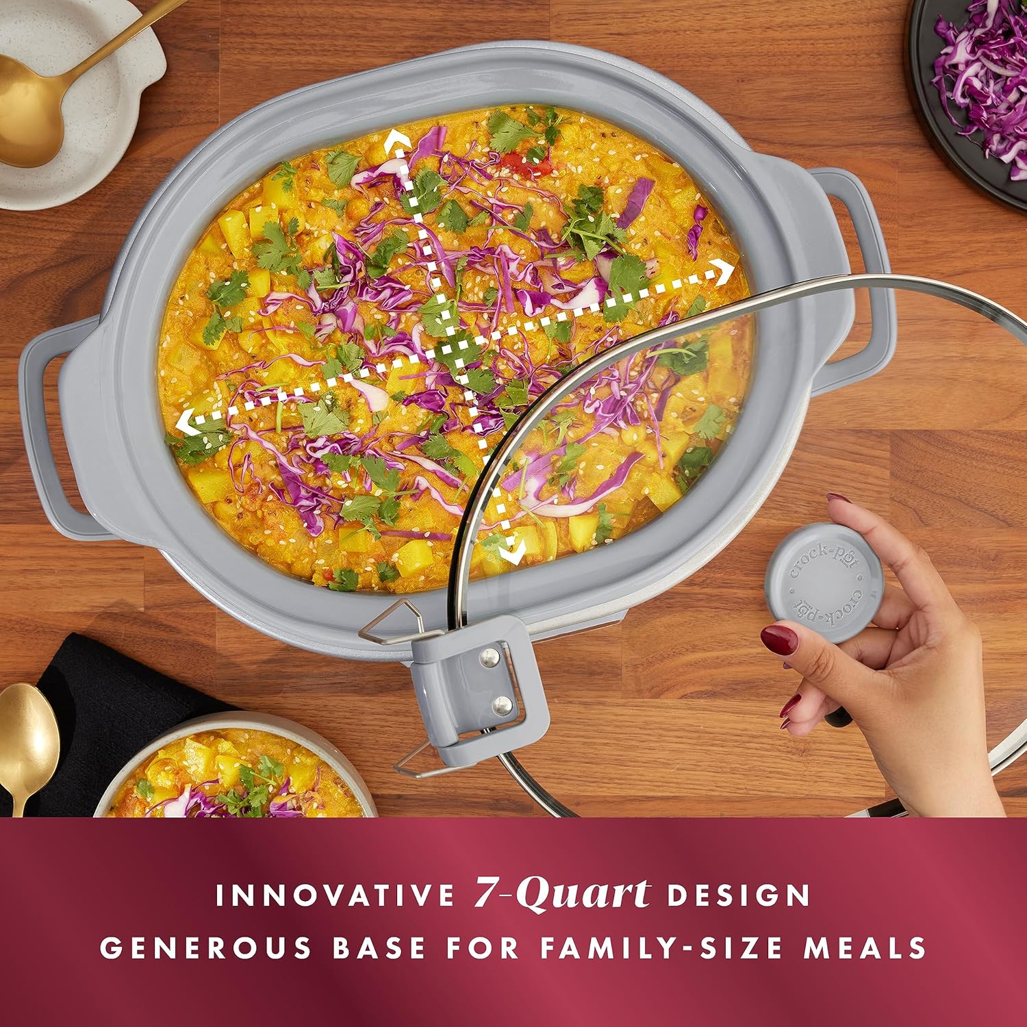Seven-quart stoneware has a new innovative design, with a generous base for larger cuts of meat and family-size meals. (*Compared with SCV700 Crock-Pot Slow Cooker.)